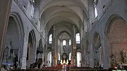Das Längsschiff erstreckt sich über sechs Jochbögen, deren ersten den Narthex bildet. Es gibt keine Seitenschiffe, stattdessen zwei Serien von fünf Kapellen, die direkt an das Längsschiff angrenzen, sowie den beiden Türmen am ersten Jochbogen.