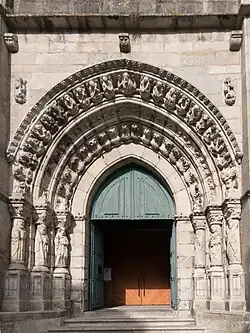 Die Westfassade der im Äußeren aus Granit erbauten Kirche präsentiert sich in einem schon damals in den meisten Teilen Europas längst überholten Übergangsstil von der Romanik zur Gotik. Das Portalgewände mit seinen eingestellten Figuren ist dreifach zurückgestuft; die Archivoltenbögen sind leicht angespitzt. Die nahezu fensterlosen seitlichen Glockentürme wirken beinahe monolithisch; sie enden jeweils in einem Wehrgang mit Zinnenkranz.