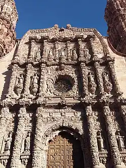 Das Äußere des Gebäudes ist mit rosafarbenem Stein verkleidet und in einer exotischen und typisch mexikanischen Mischung aus Churriguera-Barock mit indigenen Elementen gestaltet. Die Hauptfassade besteht aus drei Körpern. Der Mittelteil ist reich verziert, die Untergeschosse der seitlichen Kirchtürme sind schlicht, ihre oberen Etagen wiederum sehr ausgearbeitet. Der Mittelteil wird durchgängig durch äußere Säulen eingerahmt und besitzt drei Etagen. Der Eingangsbogen des Portals ist mit Engeln und verschiedenen floralen Motiven verziert, zwischen Weinreben und Muscheln befinden sich Nischen mit Skulpturen der Apostel Jakob, Petrus, Paulus und Andreas. In der zweiten Ebene umranken die komplexen Ornamente aus Pflanzenmotiven und Engeln das mittlere Rundfenster und die Figuren der vier Kirchenlehrer der lateinischen Kirche mit ihren jeweiligen Eigenschaften: St. Gregor der Große, St. Hieronymus, St. Augustinus von Hippo und St. Ambrosius von Mailand. Die niedrigere dritte Etage wird durch barocke Pilaster mit Engelsfiguren gegliedert. In den dazwischenliegenden Nischen stehen fünf Skulpturen: Vier Apostel um die zentrale Figur Jesu Christi. Im Giebel darüber eine Darstellung des ewigen Vaters.[4]