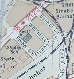Die Kirche der Katholisch-Apostolischen Gemeinde in der Friedrichstadt ist vermutlich um 1885 erbaut worden, durch großzügige finanzielle Unterstützung von Ernst Hermann Vogel. Das Gebäude war ein anderthalb-geschossiger Bau in Sandstein-Ziegel-Ausführung mit verputzter Fassade im Hof des Grundstückes. Am Giebel zur Fröbelstraße befand sich das Strahlenkreuzfenster. Am Giebel zur Wölfnitzstraße waren zwei halbrunde angesetzte Ecken. Später wurde eine halbkreisförmige Apsis als Altarraum angefügt. An den Längsseiten waren fünf längliche Rundbogenfenster mit bunter Bleiverglasung. Es war in dem turmlosen schlichten Gebäude für ca. 90 Gläubige Platz. Das Kirchengebäude verfügte über eine Orgel der Jehmlich Orgelbau Dresden.[1] Am 13. Februar 1945, beim ersten Angriff, wurde die Kirche von Sprengbomben getroffen und beschädigt. Ein Teil der Fenster konnte zwischen den Angriffen geborgen werden, wie auch Kelche und andere Gegenstände und Gefäße. Der darauffolgende Angriff zerstörte das Gebäude bis auf die Grundmauern.[1]