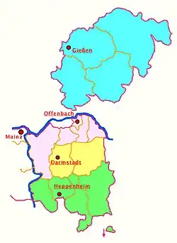 Die vier hessischen Regionen des Diözesanbildungswerkes Mainz mit Sitz in Gießen, Offenbach, Darmstadt und Heppenheim
