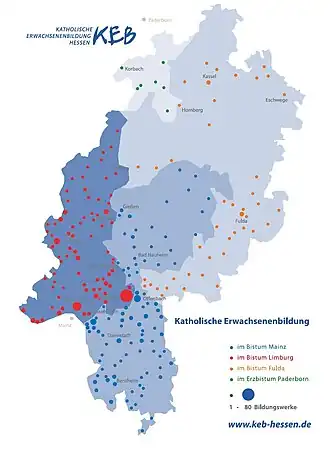 Die Ansprache neuer Teilnehmergruppen gewinnt an Bedeutung und wird durch verschiedene Angebote unterstützt.[7] Eine jüngere Programmanalyse von 2013[8], welche die Profile konfessioneller Erwachsenenbildung in Hessen untersucht, kommt dabei zu dem Schluss, dass die Angebote der katholischen Erwachsenenbildung ein breites Spektrum an Themenfeldern, Referenten und Zielgruppen abdecken. Die Orte und Zeiten, an denen Bildungsarbeit geschieht, sind aufgrund der kirchlichen Infrastruktur in Hessen ebenfalls stark ausdifferenziert.