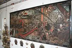 - Das grosse Gemälde an der Nordwand in Öl auf Leinwand misst 4 auf 9 Meter und wurde 1630 im Auftrag der Rosenkranzbruderschaft von Giovanni Battista Macholino gemalt 1656[1]. Dargestellt ist die Seeschlacht von Lepanto, in der die christlichen Alliierten die osmanischen Truppen besiegten.