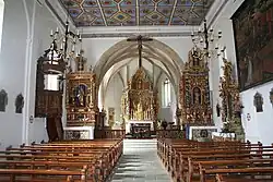 - Das lebensgrosse spätgotische Kruzifix im Chorbogen stammt wie der Tabernakel aus der Zeit um 1500.