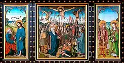 Die Kirche ist im Besitz eines um 1480 entstandenen Flügelaltars, der dem Umkreis des Hausbuchmeisters zugeordnet wird. Das ursprünglich nur dreiflügelige Retabel zeigt im offenen Zustand im Hauptbild eine Kreuzigungsgruppe. Der linke Flügel weist eine Schlüsselübergabe an Petrus und der rechte Flügel die Heiligen Sebastian und Katharina auf. Im geschlossenen Zustand ist eine Verkündigungsgruppe auf der Außenseite zu sehen. Die Außenflügel wurden im Jahre 1892 neugotisch hinzugefügt und stellen von links nach rechts die Heiligen Goar, Nikolaus, Clara, Elisabeth, Matthias und Hildegard dar.
