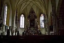 Das Langhaus besteht aus zwei quadratischen Jochen mit einem vierteiligen Rauten-Stern-Rippengewölbe. Der niedrige Triumphbogen ist eingeschnürt und hat einen Spitzbogen. Der hohe Chor wurde vermutlich im letzten Viertel des 15. Jahrhunderts errichtet. Er ist genauso breit wie das Kirchenschiff und besteht aus zwei schmalrechteckigen Jochen mit einem 5/8-Schluss. Über dem Chor ist ein Netzrippengewölbe. Außen wird die Kirche durch abgetreppte Strebepfeiler gestützt. Am östlichen Joch des Langschiffes ist im Süden ein etwa quadratisches Seitenschiffjoch, die Frauenkapelle angebaut. Darüber ist ein achtteiliges Rautensternrippengewölbe mit rundem Schlussstein. Auf diesem befindet sich eine Bauinschrift von 1429 und ein Steinmetzzeichen. Die beiden nach Osten anschließenden, schmalen Joche korrespondieren mit den Chorjochen, das westliche mit einem vierteiligen Rautenstern, das östliche mit bemalten Rippen. Durch Spitzbogenarkaden ist das Seitenschiff mit dem Langschiff verbunden. Die Säulen sind als Runddienste ausgeführt. Im Süden der beiden östlichen Seitenschiffe ist die alte Sakristei, heute Taufkapelle, vom Ende des 15. Jahrhunderts angebaut sowie die Frauenkapelle von 1498. In der Taufkapelle ist ein Sternrippengewölbe, in der Frauenkapelle Gewölbe mit Akanthusstuck und beginnendem Bandelwerk aus dem Jahr 1709. Sieben Stufen führen vom Seitenschiff in die Frauenkapelle. In den Bildfeldern sind Stationen aus dem Leben Mariens dargestellt. Davor ist ein gleichzeitiges Schmiedeeisengitter. Unter der Frauenkapelle liegt die Allerseelenkapelle mit einer aus Ziegeln gemauerten Altarmensa zwischen den beiden Bögen zum ehemaligen Karner, der unterhalb der heutigen Sakristei liegt. Die Zugänge zur Kapelle wurden vermauert. Im Norden vom Chor befindet sich die Josephs-Kapelle aus dem Jahr 1735 mit Bandlwerksstuck und Putti mit Tischlerwerkzeug. Vor dem Altar mit den barocken Statuen des heiligen Zacharias und der heiligen Elisabet steht ein neugotischer Taufbrunnen. Rechts neben der Taufkapelle hängt eine Kopie des Mariahilfbildes in Innsbruck von Lucas Cranach.