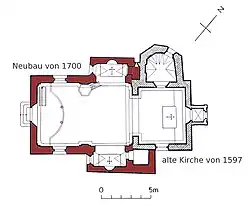 Die erste Kirche wurde 1597 gebaut und am 6. August 1600 geweiht. Am 3. Juli 1696 erfolgte die Grundsteinlegung der heutigen Kirche. Sie wurde im rechten Winkel zur alten Kirche gebaut, wobei deren Langhaus zum heutigen Chor wurde. Der alte Chor an der Nordwestseite dient heute als Sakristei. Der Bau wurde 1700 vollendet, am 4. Juli 1704 wurden die beiden Heiligen konsekriert. 1977 fand eine Aussenrenovation statt, 2003/4 eine Gesamtrestauration.
