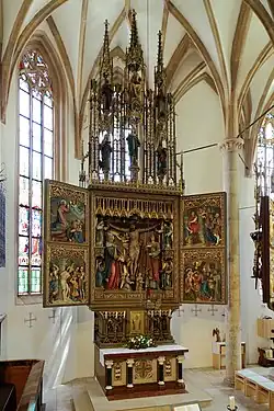 Das beherrschende Mittelstück stellt eine Kreuzigungsszene dar. Die Flügel zeigen oben die Bischöfe Rupert mit dem Salzfass und Wolfgang mit dem Beil, jeweils zusammen mit einem anderen Bischof. Die beiden Bilder darunter zeigen die Heilige Anna mit Maria und dem Jesuskind (Anna selbdritt) sowie den Heiligen Christophorus. Der Fuß und der obere Abschluss wurden 1897 vom Hallstätter Bildhauer David Binder geschnitzt.