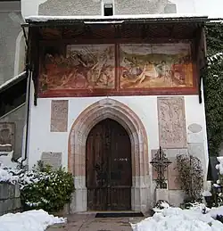 Der Haupteingang der Kirche ist das große Südportal, das 1519 entstanden ist. Über dem Portal befinden sich zwei Fresken eines unbekannten Meisters der Donauschule.[2] Im Vorraum befindet sich eine um 1500 entstandene Kreuzigungsgruppe, die vermutlich vom Meister des Hauptaltares stammt.