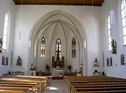Der Innenraum des Langhauses ist mit einer Holzbalkendecke auf Unterzügen überspannt, der des Chors mit einem Kreuzrippengewölbe. Die Statuen, die die Apostel Petrus und Paulus darstellen, stammen aus der Barockzeit. Die Orgel wurde 1985 als Opus 132 von der Firma Orgelbau Sandtner in den Prospekt von 1908 eingebaut.[1]