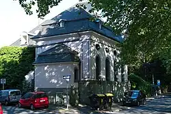 Die mit ihrem Fundament in die Straßenecke Hochstraße/Malerstraße in die Friedhofsmauer integrierte Kapelle ist ein eingeschossiger Kapellenbau in Massivbauweise mit angrenzendem zweigeschossigen Gebäudekomplex an der Malerstraße. Das durchweg im Stil des Bergischen Neobarock erbaute Gebäude ist auf einen verhältnismäßig hohen Gebäudesockel gesetzt, welcher aus grob behauenem Quadersandstein errichtet wurde. Ein Choranbau befindet sich an der Nordseite der Kapelle zur Malerstraße hin versetzt. Gegliedert wird das nach Norden ausgerichtete Gebäude von vier hohen, abgerundeten Fenstern an der Westseite, wohingegen an der Ostseite der Kapelle der zweigeschossige Gebäudekomplex angrenzt. Die vier Fenster werden jeweils noch von einem Rundfenster gekrönt, welche wiederum von einem Karniesbogen abgeschlossen werden. An die Südseite vorgezogen befindet sich auf dem schiefergedeckten Mansarddach ein kleiner Dachreiter mit vier Schallöffnungen, welcher eine einfache Glocke mit dem Schlagton f2 beherbergt.