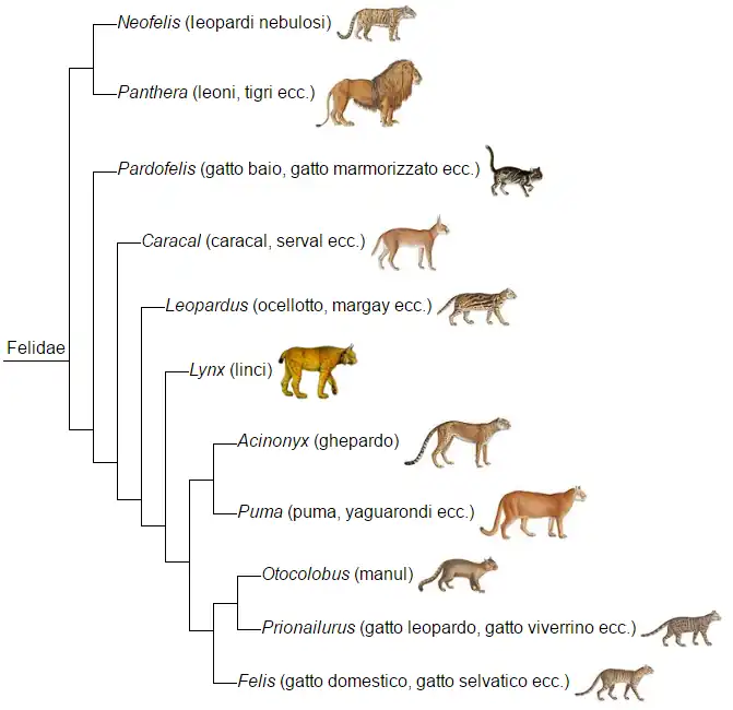 Das folgende Kladogramm stellt die stammesgeschichtlichen Verwandtschaftsverhältnisse der Katzen dar. Es folgt dabei Piras et al. 2013:[16]