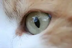 Die Augen der Katzen sind im Verhältnis zum Schädel relativ groß. Die Pupillen der Katzenaugen sind in ihrer Öffnungsgröße stark veränderbar: Bei hellem Umgebungslicht sind die Pupillen bei Kleinkatzen senkrecht schlitzförmig, bei anderen Katzenarten klein und rund, bei Dunkelheit sind die Pupillen extrem weit geöffnet.[3] Einige Katzen besitzen multifokale Linsen, die eine höhere Sehschärfe ermöglichen. Hauskatzen besitzen solche Linsen (und die entsprechenden schlitzförmigen Pupillen). Andere Katzen, beispielsweise Sibirische Tiger, haben „gewöhnliche“ monofokale Linsen.[4]