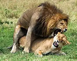 Da die meisten Katzenarten Einzelgänger sind und direkte Begegnungen mit Artgenossen vermieden werden, reduzieren sich diese vor allem auf die Zeit der Fortpflanzung. Die Geschlechter kommunizieren über ihre Paarungsbereitschaft dabei vor allem über Düfte und vor allem die Weibchen hinterlassen Duftmarken mit ihrem Urin im Umfeld ihrer Reviere, die von den Männchen aufgespürt werden. Zudem kommunizieren die Weibchen verschiedener Arten während ihrer fruchtbaren Phasen über Rufe, die paarungswillige Männchen anlocken. In der Regel nähern sich die Männchen den Weibchen und verfolgen sie, teilweise mehrere Tage, um sich nach einer gewissen Gewöhnung mit ihnen zu verpaaren, wenn die Weibchen dazu bereit sind. Zu rasche Annäherungen können dagegen zu aggressivem und ablehnendem Verhalten durch die Weibchen führen, bei denen im Extremfall auch einer der Partner getötet werden kann.[14] Die Paare bleiben in der Regel einige Tage beisammen und bei den meisten Arten locken die Weibchen mehr als ein Männchen an, das sich mit ihnen paaren möchte. Vor allem bei Tigern, Jaguaren, Pumas und Luchsen wurden mehrfach mehrere Männchen beobachtet, die einem einzelnen Weibchen folgen. Sobald das Weibchen paarungsbereit ist, kann es bei den Männchen zu Rivalenkämpfen kommen. Bei der Paarung selbst besteigt das Männchen das Weibchen und greift es mit den Zähnen im Nacken. Zum Ende der Paarung windet sich das Weibchen unter dem Männchen hervor und wirft dieses ab. Die Paarung selbst ist nur sehr kurz und dauert in der Regel etwa 3 bis 20 Sekunden, allerdings kommt es bei den meisten Katzen zu zahlreichen Paarungen über mehrere Tage. Bei Löwen liegen Beobachtungen vor, bei denen ein Paar 157 mal innerhalb von mehr als 55 Stunden kopulierte. Ähnlich häufig sind auch die Verpaarungen bei Tigern, Leoparden und Jaguaren, während sie bei kleineren Katzen deutlich weniger häufig stattfinden.[14]