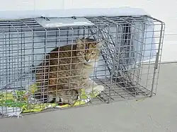 Eine Katzenfalle dient als Lebendfalle dazu, verwilderte Katzen einzufangen. Da in Deutschland Katzen nicht als Schädlinge angesehen werden, ist das unsachgemäße Töten von Wirbeltieren laut Tierschutzgesetz verboten.[1]