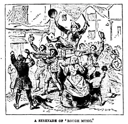 Im Brauchtum der Naturvölker genau wie in dem der älteren und jüngeren Hochkulturen kommt der Musik in der Gesellschaft eine regelnde Kraft zu. Während bestimmte Formen des Gesanges und der Instrumentalmusik sowie bestimmte Musikinstrumente und Zusammenklänge („Tonarten“) aufbauende Wirkungen auf die Entwicklung des Zusammenlebens einer Gesellschaft haben können (siehe: Konfuzius, Platon, al-Farabi, Boëthius),[1] dient Katzenmusik dazu, innerhalb einer Gemeinschaft als Missstände und Normbrüche empfundene Zustände oder Handlungen öffentlich zu machen und anzuprangern. Eine der wichtigsten Aufgaben bestand in einer rügegerichtlichen Funktion, die – ohne rechtliche Grundlage – das Recht ergänzte. Der Vollzug war, soweit er im Zusammenhang mit Fastnacht und Karneval stand, oft mit Komik verbunden. Er hatte für die Gerügten aber zuweilen nachhaltige Folgen. Ausgeführt wurde eine solche Katzenmusik durch öffentliches Belärmen der zu maßregelnden Person in Form von Lärmaufzügen und Spottgesängen. Zusätzlich konnte es noch zur Belagerung des Hauses, körperlicher Züchtigung, Beschmutzen der Tür, Einschlagen von Fenstern, Zerstörung von Ofen oder Dach bis zur Vertreibung und Ächtung der Betroffenen kommen. Die Redewendung „einem aufs Dach steigen“ entstammt diesem mittelalterlichen Rügebrauch.[2]