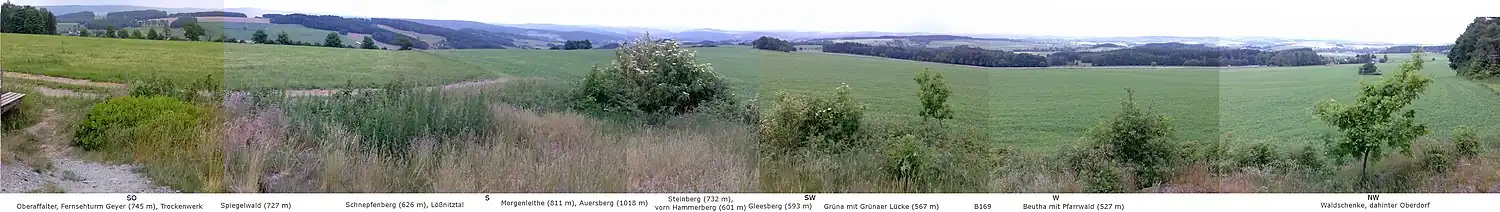 Die Aussicht umfasst weite Teile des westlichen Erzgebirges, des Erzgebirgsvorlandes bis in die Leipziger Tieflandsbucht hinein. In südlicher Richtung sind vor allem der Fichtel- (29 km), Keil- (32 km), Platten- (29 km), Auers- (26 km), Scheibenberg, der Bärenstein (25 km), der Spiegelwald (9 km), die Morgenleithe (15 km), das Oberbecken des Pumpspeicherwerkes Markersbach (18 km) und der Geyerische Fernsehturm zu sehen, im Norden die beiden Schornsteine des Braunkohlekraftwerks Lippendorf bei Böhlen (64 km). An nur einigen wenigen Tagen im Jahr ist auch eine Fernsicht zum Völkerschlachtdenkmal (77 km) in Leipzig möglich. Früher konnte man außerdem westlich vier Spitzkegelhalden (50 km) ausmachen, welche ein Relikt des Ronneburger Uranbergbaus waren, deren Einebnung seit 2007 abgeschlossen ist.