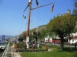 • Der Kauber Schiffermast am Rheinufer in Nähe des Pegelturms mit dem Lotsenmuseum in der ehemaligen Lotsenstation.