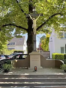 Im Sockel findet sich die lateinische Inschrift O crux ave, spes unica (‚Sei gegrüßt, o Kreuz, einzige Hoffnung‘).