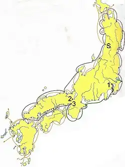 - ↑ Westumfahrung: Schwarz, Ostumfahrung: Rot. S: Ausgangshafen Sakata, 1: Ziel Edo, 2: Kyōto, 3: Osaka.
