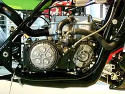 Der Motor war ein wassergekühlter Zweizylinder-Tandemmotor mit Drehschiebersteuerung. Jeder Zylinder verfügte über eine eigene Kurbelwelle, die über eine Stirnradverzahnung gegenläufig miteinander gekoppelt waren. Die beiden 34-Millimeter-Mikuni-Rundschiebervergaser waren auf der linken Gehäuseseite angebracht. Auf dem rechten Kurbelwellenstumpf des vorderen Zylinders saß die Magnetzündung, auf dem des hinteren die Wasserpumpe. Die Mehrscheibentrockenkupplung sitzt auf der Getriebeeingangswelle rechts, die Sekundärkette links.[1]