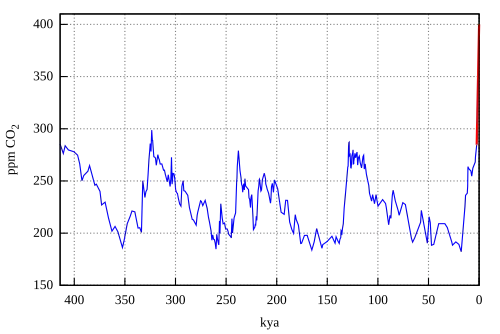 Während der letzten 800.000 Jahre war die Konzentration von Kohlenstoffdioxid in der Erdatmosphäre nie größer als 300 ppm. In den 750 Jahren zwischen 1000 und 1750 n. Chr. lag der CO2-Anteil in der Erdatmosphäre zwischen 275 und 285 ppm. Lag der CO2-Anteil in der Erdatmosphäre Anfang der 1950er Jahre noch bei etwa 310 ppm, hat er im Frühjahr 2013 an der Messstation am Mauna Loa erstmals 400 ppm überstiegen und lag im Mai 2022 bei 420 ppm.[23]