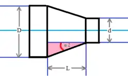 Zum Kegelverhältnis gehört auch der Kegelwinkel , der den Öffnungswinkel des Kegels beschreibt. In nebenstehender Skizze ist die Gegenkathete zum halben Öffnungswinkel im getönten rechtwinkligen Dreieck gleich , die Ankathete gleich . Der mathematische Zusammenhang zwischen dem Tangens (= Gegenkathete durch Ankathete) des halben Öffnungswinkels und dem Kegelverhältnis lautet daher: