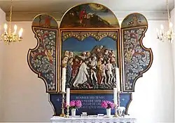 Der Mittelteil des Altarretabels von ca. 1450–1475 stammt wohl aus der Kirche in Sønderborg, die 1618 ein neues Retabel anschaffte, und zeigt die Kreuztragung Christi. Simon von Kyrene ist gerade dabei, dem stürzenden Christus das Kreuz abzunehmen. Links folgen der Jünger Johannes und die drei Marien, während rechts die beiden Schächer von Soldaten zur Kreuzigung abgeführt werden. Im Vordergrund wirft sich ein Kind Christus zu Füßen, während ein anderes rechts auf einem Stecken reitet. Die beiden Seitenflügel des Altars sind rückseitig spätgotisch mit Michaels Drachenkampf und dem heiligen Nikolaus bemalt. Um 1700 wurden die Seitenflügel beschnitten, so dass sie nicht mehr schließen, und auf der Innenseite neu bemalt. Zudem erhielt das Retabel drei rundbogige Malereien als oberen Abschluss, auf denen von links nach rechts zu sehen sind: Moses und die eherne Schlange; Abraham und die Bindung Isaaks; Christus als der gute Hirte. Die beiden kleinen Rundbögen der Seitenflügel, die umgeklappt werden können, zeigen auf ihren Rückseiten den Apostel Petrus und Christus mit der Siegesfahne. Die Predella ist ursprünglich, aber zurechtgesägt und wurde 1928 auf Dänisch mit dem Heilandsruf (Mt 11,28 ) bemalt.[7]