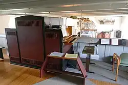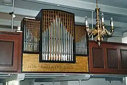 In den Kirchenrechnungen werden 1845/1846 Kosten zur Reparatur der Orgel erwähnt, doch kann es sich dabei nur um ein Harmonium gehandelt haben.[10] Die erste Pfeifenorgel wurde im Juni 1870 von Marcussen & Søn geliefert und hatte vier Register.[11] 1961 wurde auf der Westempore eine neue Orgel der Brødrene Bruhn eingebaut, sie wurde 1987 von derselben Firma überholt. Mit Rücksicht auf die tiefe Decke über der Empore ist das Orgelgehäuse nur 1,70 m hoch. Das pedallose, seitenspielige Instrument besitzt ein Manual mit sechs Registern und folgender Disposition:[12]