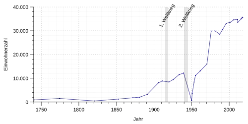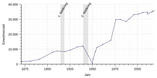 Die Fortschreibung nach der Volkszählung 1987 ergab eine Einwohnerzahl zum Mai 2011 von 34.870. Nach dem Zensus 2011 wurde diese Zahl auf 33.551 korrigiert.[13] Ungefähr 3.000 Franzosen (etwa 8 % der Gesamtbevölkerung) leben in Kehl.[14] Von den rund 27.800 Wahlberechtigten sind ca. 3.200 nicht-deutsche EU-Bürger.[15] Insgesamt haben 32,8 % der Einwohner Kehls einen Migrationshintergrund.[16] Menschen aus über 100 Nationen leben in der Kleinstadt am Rhein.[17]