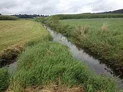- Riedetsweiler Graben[LUBW 7], von rechts und Südsüdwesten auf etwa 650 m ü. NHN unweit des Hippetsweiler Ortseingangs der aus Wald kommenden Pfullendorfer Straße (L 212), 1,8 km und ca. 0,9 km².[LUBW 6] Entsteht auf etwa 680 m ü. NHN wenig nordöstlich von Rothenlachen neben einer kleinen Waldinsel. Im Bereich dieses Zuflusses läuft der Kehlbach fast schon östlich.