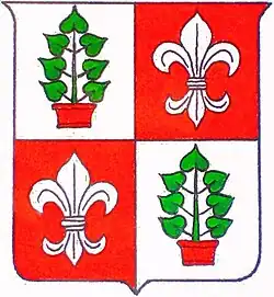 Blasonierung: „Geviertet, 1 und 4, in Silber eine aus einem roten Topf wachsende siebenblätterige grüne Linde, 2 und 3, in Rot eine silberne Lilie.“[6] |