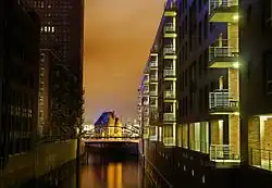 Die Brooksbrücke führt von der Straße Bei den Mühren über den Zollkanal bei der Einmündung zum Binnenhafen hinüber zum Brook auf dem Kehrwieder.