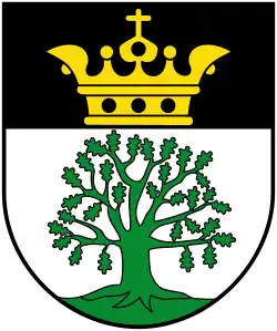 Blasonierung: „Erhöht geteilt von Schwarz und Silber (Weiß), oben eine mit einem Kreuz besteckte und mit drei schwarzen Kugeln belegte goldene (gelbe) Krone, unten aus grünem Schildfuß wachsend eine grüne Eiche.“ |