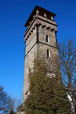 Im Gelände des einstigen Ringwalls Kellerskopf steht ein ca. 20 m hoher Aussichtsturm mit angegliedertem Berggasthof Kellerskopf, in dessen Wintergarten ein Standesamt eingerichtet ist. Mitte 2007 wurden beide geschlossen und anschließend saniert. Am 17. Oktober 2008[3] fand die Wiedereröffnung statt. Bereits 1989 war am Turm eine Sanierung vorgenommen worden, an die eine Gedenktafel neben dem Eingang erinnert. Im Innern des rechteckigen Turms erreicht man über 100 Steinstufen die in 18,5 m[4] Turmhöhe liegende überdachte Aussichtsplattform. Von dieser reicht der Blick über das Rhein-Main-Gebiet bis zum Odenwald, Pfälzerwald und Nordpfälzer Bergland mit dem Donnersberg.