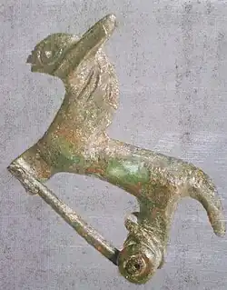 - eine 3,2 cm lange und 2,4 cm hohe bronzene Pferdchenfibel mit vierschleifiger Spirale, Zierscheiben und Sehne
