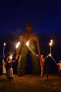 Er erwähnt auch an dieser Stelle den Brauch des Wicker man, bei dem ein aus Ruten geflochtenes riesiges Standbild (immani magnitudine simulacra) mit Menschen gefüllt und angezündet werde. Dieser fragwürdige Bericht geht möglicherweise auf eine Stelle bei Poseidonios zurück, die auch von Strabon (IV, 4,5) und Diodor (V, 32) zitiert wird.[42] In den Berner Lukan-Scholien werden für die Götter Teutates, Esus und Taranis verschiedene Opferriten beschrieben. Die Opferung durch Versenken in einem Moor war offenbar sowohl auf dem Festland als auch im inselkeltischen Bereich gebräuchlich. Als Beispiele dafür könnten der Lindow-Mann aus England und der Old-Croghan-Mann aus Irland stehen, die beide deutliche Tötungsspuren zeigen, wenn auch hier eine saubere Trennung zwischen Opferung oder Hinrichtung schwerfällt.[43][44] Auf die Opferung des Königs wird beim Sakralkönigtum eingegangen.