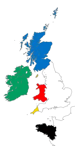 • Die „sechs Keltischen Nationen“, in denen es bis in die Frühe Neuzeit eine signifikante Anzahl Sprecher keltischer Sprachen gab.