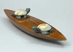 Eine ebene Fläche und die senkrecht darauf wirkende Schwerkraft sind rotationssymmetrisch. Die Existenz einer Vorzugs-Rotationsrichtung des Wackelkörpers muss daher aus Eigenschaften dieses Körpers selbst ableitbar sein. Ist der Wackelstein ein flacher zweifach-achsparalleler Abschnitt eines länglichen oder Ellipsoids, so gilt in Längs- und Querrichtung Spiegelsymmetrie. Aber die zusätzlichen Schwungmassen am Wackelstein (im Bild die Schildkröten) sitzen, ähnlich wie die Paddler in einem Zweier-Canadier, diagonal, nämlich rechts und links jeweils etwas seitlich der Boots-Längsachse.