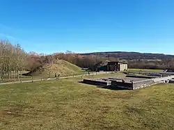 Die Anlage wurde zwischen 1996 und 1999 mit Mitteln des Saarpfalz-Kreises rekonstruiert und am 26. Juni 1999 eingeweiht. Die Stelle, an der sich die Nachbildungen der drei Grabhügel heute befinden, ist nicht die Fundstelle der Gräber. Die Originalfundstellen lagen ca. 100 Meter weiter südöstlich. Sie sind heute nicht mehr vorhanden, da sie durch den Kies- und Sandabbau der Sandgrube zerstört wurden. Den Eingang zum Grabhügel der Fürstin bildet ein Pavillon mit einem Informationsstand mit der Kasse, an dem weiterführende Literatur erworben werden kann, verschiedene Informationstafeln sowie einer Videowand. Von dort gelangt man über eine nach unten führende Treppe, vorbei an weiteren Informationstafeln, in den eigentlichen Ausstellungsraum des Grabhügels. An den Wänden befinden sich zusätzliche Informationstafeln sowie Vitrinen, in denen die Replikate einiger Fundstücke ausgestellt sind. Das Zentrum des Ausstellungsraumes bildet die Nachbildung des Grabes. Die Ausrichtung der im Grabhügel rekonstruierten Grabkammer stimmt mit dem Originalbefund überein. Dabei betrachtet man die Grabkammer vom Westen aus, also von der Seite des Grabes, der beim Fund bereits abgegraben war. Unter der Grabkammer ist das aus dem Grabungsbericht bekannte Profil nachgebildet. Die Tote wird in der Grabkammer durch eine bekleidete Gipsfigur dargestellt, die Replikate des Torques, der goldenen Armringe und Fingerringe trägt. Links neben ihrem Kopf liegen ein Replikat der Stangengliederkette sowie des Bernsteincolliers und der Büchse und rechts das Replikat des Spiegels. Die Darstellung der Begräbnissituation in der Grabkammer stimmt nicht in allen Details mit dem Befund überein, um dem Betrachter einen optimalen Blick auf die Funde zu gewähren. Eines dieser Details ist, dass nur die Verstorbene und ein Teil der Fundstücke auf einer Matte liegen, wohingegen die Funde von fasrigem Gewebe an einer der Bronzeschüsseln darauf hinweisen, dass wohl der gesamte Boden der Kammer mit einer Schilf- oder Bastmatte ausgelegt war. Ebenso ist die Darstellung des Trinkgeschirrs auf einem Tisch nebst vergoldeter Bronzekanne nicht unumstritten. Holzreste, die sich unter der Bronzekanne erhalten hatten, weisen auf den Dielenboden als Ursprung hin.[54] Zudem wurde unter der kleinen Bronzeschale ebenfalls ein Holzrest gefunden, der wahrscheinlich ein Rest des Dielenbodens ist. Zwischen diesen Holzresten und der Schale hafteten fasriges Gewebe des Bodenbelages sowie die Reste eines Leinengewebes an.[55]