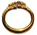 | Armreif | Gold | Glatter, hohler ovaler Armreif. Details der Oberfläche ziseliert, gepunzt und graviert. Im Gießverfahren hergestellt. Aus mehreren Teilen zusammengesetzt.[A 2][18] Durchmesser außen 80,5 mm, innen 61 mm. Gewicht 117,1 g. An beiden Enden eine figürliche Darstellung mit Kopf und Brustbereich. Auf dem Kopf vogelartiger Schmuck und Helm in Gestalt eines Raubvogels. An den Schultern Flügel. Die vor der Brust gehaltenen Hände halten einen nicht identifizierbarer Gegenstand. Darstellung der Haare sowie eines Kleides. Über den Köpfen mit Blickrichtung nach außen die Darstellung zweier Raubkatzen, deren Schnurrhaare als gepunzte Punkte zu erkennen sind. Die figürliche Darstellung vereint Attribute der Göttinnen Artemis und Minerva. | 1 | Keller Nr. 2 |