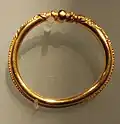 | Armring | Gold | Durchmesser 67,7 mm außen, innen 54,7 mm. Gewicht 29,6 g. Steckverschluss. Mit Ornamenten verziert. Vermutlich aus der gleichen Werkstatt wie der Torques. | 1 | Keller Nr. 3 |