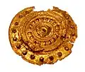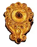 | Rosette | Gold | Durchmesser 10 mm bis 10,3 mm. Stärke 0,15 mm. Gewicht 0,4 g. Bei den manschettenförmigen Beschlägen gefunden. Vermutlich Teile des Zubehörs der Trinkhörner. Eventuell Verzierung des Deckels oder eines Trageriemens.[30] | 3 | Keller Nr. 9 | ||