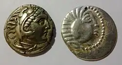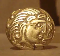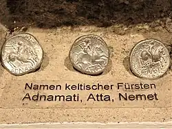 - ↑ Gisela Förschner: Die Münzen der Kelten-Ausstellung der Bestände des Münzkabinetts (= Kleine Schriften des Historischen Museums Frankfurt am Main. Band 18). Verlag Gutenberg, Melsungen 1983, ISBN 3-87280-019-1, S. 14.