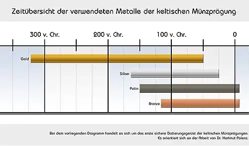 Systematische Auswertungen von Grabfunden haben ergeben, dass in der keltischen Münzprägung im Laufe der Zeit unterschiedliche Metalle verwendet wurden. Im Gegensatz zu den griechischen oder römischen Münzen waren die ersten keltischen Münzen aus Gold. Diese Goldmünzen wurden bis zur Mitte des 1. Jahrhunderts v. Chr. geprägt und dienten zunächst wahrscheinlich lediglich dem Informationsaustausch sowie als Schatzgeld. Ab der Mitte des 2. Jahrhunderts v. Chr. bis zur römischen Eroberung Galliens wurden auch Silbermünzen geprägt. Spätestens zu Beginn des 1. Jahrhunderts v. Chr. war zumindest die westliche (gallische) Oppidakultur dazu übergegangen, Münzen aus Gold, Silber und Bronze zu prägen. Die typische Legierung aus Kupfer und Zinn wird als „keltische Münzbronze“ bezeichnet[2]. Die französische Sprache kennt dafür die Bezeichnung Potin und unterscheidet zwischen „Potin gris“ und „Potin jaune“[3]. Die keltischen Münzen bilden kein einheitliches Münzsystem. Im ostkeltischen Raum und am Mittelmeer dominierte Silber als Münzmetall, im Westen hingegen Gold.