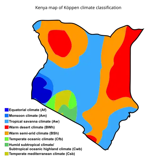 Kenia liegt in der subtropischen und tropischen Klimazone. Im Hochland kommt es über 1800 m von April bis Juni und von Oktober bis November zu Regenperioden. Der Niederschlag fällt meist nachmittags, abends und nachts. Die Nächte sind relativ kühl. Die kälteste Zeit in dieser Region liegt im Juli und August mit etwa 10 °C täglichem Minimum. Die warme Periode liegt im Januar und Februar mit etwa 25 bis 26 °C täglichem Maximum. Die Luftfeuchtigkeit beträgt etwa 65 Prozent. In Nairobi liegen die Temperaturen im Juli bei 11 bis 21 °C und im Februar bei 13 bis 26 °C. Die jährliche durchschnittliche Niederschlagsmenge liegt in Nairobi bei 958 mm. Am Victoriasee sind die Temperaturen viel höher, hier gibt es zum Teil starke Regenfälle.