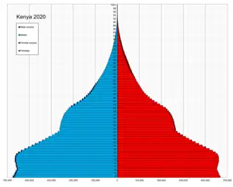 Kenia hatte 2023 55,1 Millionen Einwohner.[11] Das jährliche Bevölkerungswachstum betrug + 2,0 %. Zum Bevölkerungswachstum trug ein Geburtenüberschuss (Geburtenziffer: 27,5 pro 1000 Einwohner[12] vs. Sterbeziffer: 7,8 pro 1000 Einwohner[13]) bei. Die Anzahl der Geburten pro Frau lag 2022 statistisch bei 3,3, die der Region Ost- und Süd-Afrika betrug 4,3.[14] Die Lebenserwartung der Einwohner Kenias ab der Geburt lag 2022 bei 62,1 Jahren[15]. Der Median des Alters der Bevölkerung lag im Jahr 2021 bei 19,2 Jahren.[16] Im Jahr 2023 waren 37,2 Prozent der Bevölkerung unter 15 Jahre,[17] während der Anteil der über 64-Jährigen 2,9 Prozent der Bevölkerung betrug.[18] Das Kenya National Bureau of Statistics ist die staatliche Statistikbehörde.