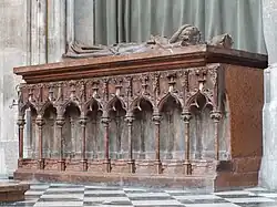 Der Sockel ist mit gotischen Bögen verziert, unter denen sich ursprünglich kleine Statuen von trauernden Mönchen und Vertretern der Universität befand. Zumindest auf jeder Längsseite waren acht Statuen. Diese sind im Laufe der Zeit verloren gegangen.