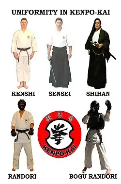 - Wettbewerb Randori (freie Übung, Kampf): Es wird Schutz zur Vermeidung möglicher Verletzungen getragen. Im Kenpo Kai-Wettkampf ist Körperkontakt, mit Ausnahme der Fäuste auf den Kopf, erlaubt.