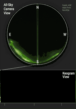 Diese Aufnahmen, die in der Regel auf der Nordhalbkugel in Nord-Süd-Richtung[3] und auf der Südhalbkugel in Süd-Nord-Richtung ausgerichtet sind,[4] werden gesammelt und bilden ein zeitabhängiges Diagramm des Polarlichts von diesem Teil des Himmels.[5] Damit lässt sich die allgemeine Aktivität des Lichts in der jeweiligen Nacht leicht erkennen, unabhängig davon, ob es durch die Wetterbedingungen unterbrochen wurde oder nicht, und die Regionen, in denen das Polarlicht zu sehen war, lassen sich anhand des Breiten- und Längengrads des Gebiets bestimmen.[6]